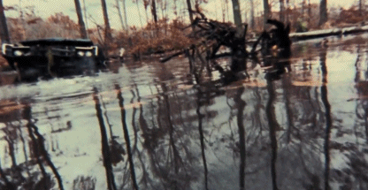镜头缓缓穿梭于丛林湖畔,慢慢抵达出场人物的位置。