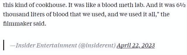 更离谱的是,由于拍摄期间耗血量超大,这血量仍然不够用,剧组还学会了如何环保用血,循环利用,搞得片场像个“造血实验室”。