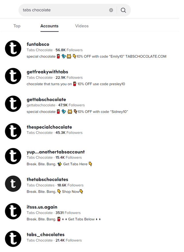 如果我们在 TK 上在 accounts 搜索框中搜索品牌关键字,我们会看到成千上万相关的账号。这样一个已经被验证的势能产品(好吃,功能有效,包装精美,体验良好),自带流量属性的产品(成人话题,有趣体验,包装吸睛),有无数种拍摄创意可以让自由职业者自由发挥。