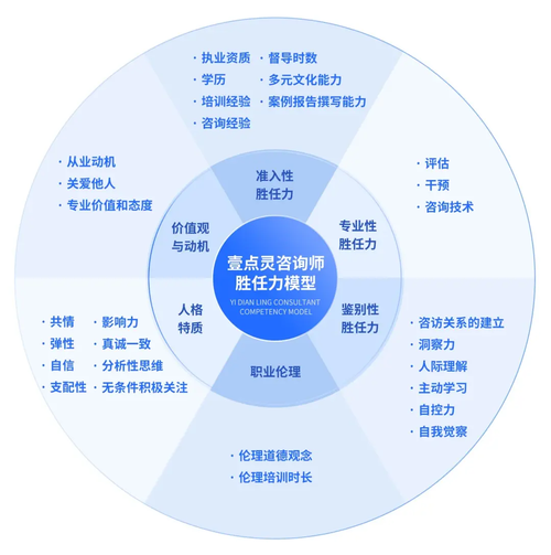 多年来,壹点灵在专业化领域持续探索与深耕,和行业top大咖紧密合作,不断推出多重定制化课程,帮助从业咨询师进行完整系统的专业成长,完成个人职业技能的蜕变。通过建立咨询师胜任力模型,对咨询师准入资质、职业伦理道德、人格特质、知识技能、职业价值观、能力提升进行明确要求。