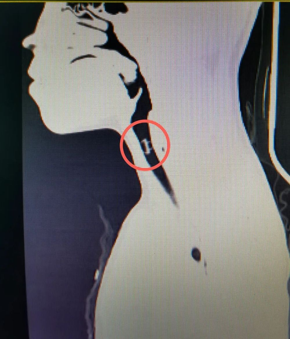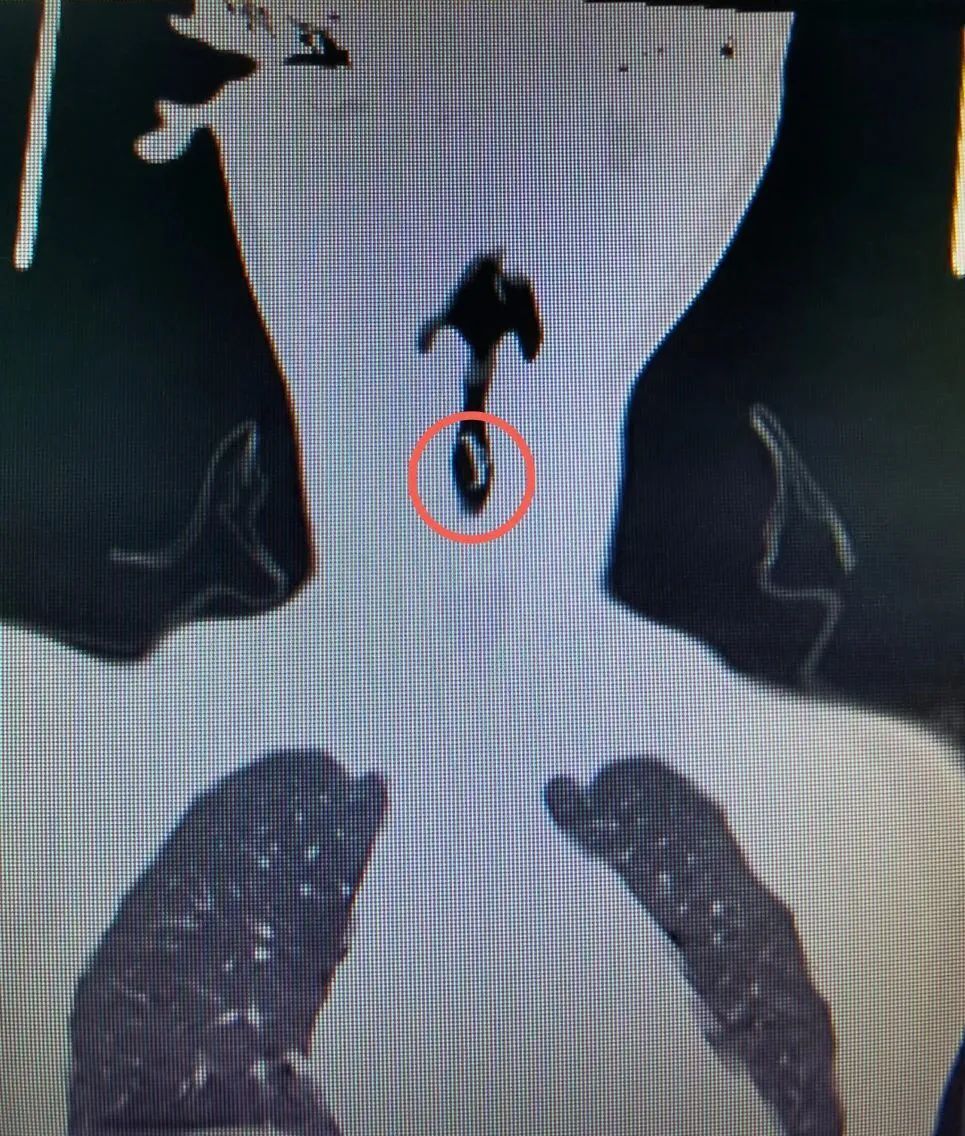 眼耳鼻喉科值班医师黄江舟予行颈部CT检查,结果显示为气管内异物,异物长1.5cm,宽1.0cm,质地坚硬,且卡在气管内平对颈前第6、7椎体水平。只见男童口唇紫绀,呼吸急促、费力,频繁刺激性咳嗽,活动后加重,吸气三凹征,咽部明显充血。眼耳鼻喉科副主任甘世勇考虑到患儿情况危急,需要多科室进行联合救治,遂立即汇报医院当日的行政值班领导韦科越院长,韦院长指示:即刻启动多学科会诊方案,尽快对患儿进行抢救,取出气管内异物,确保患儿安全。