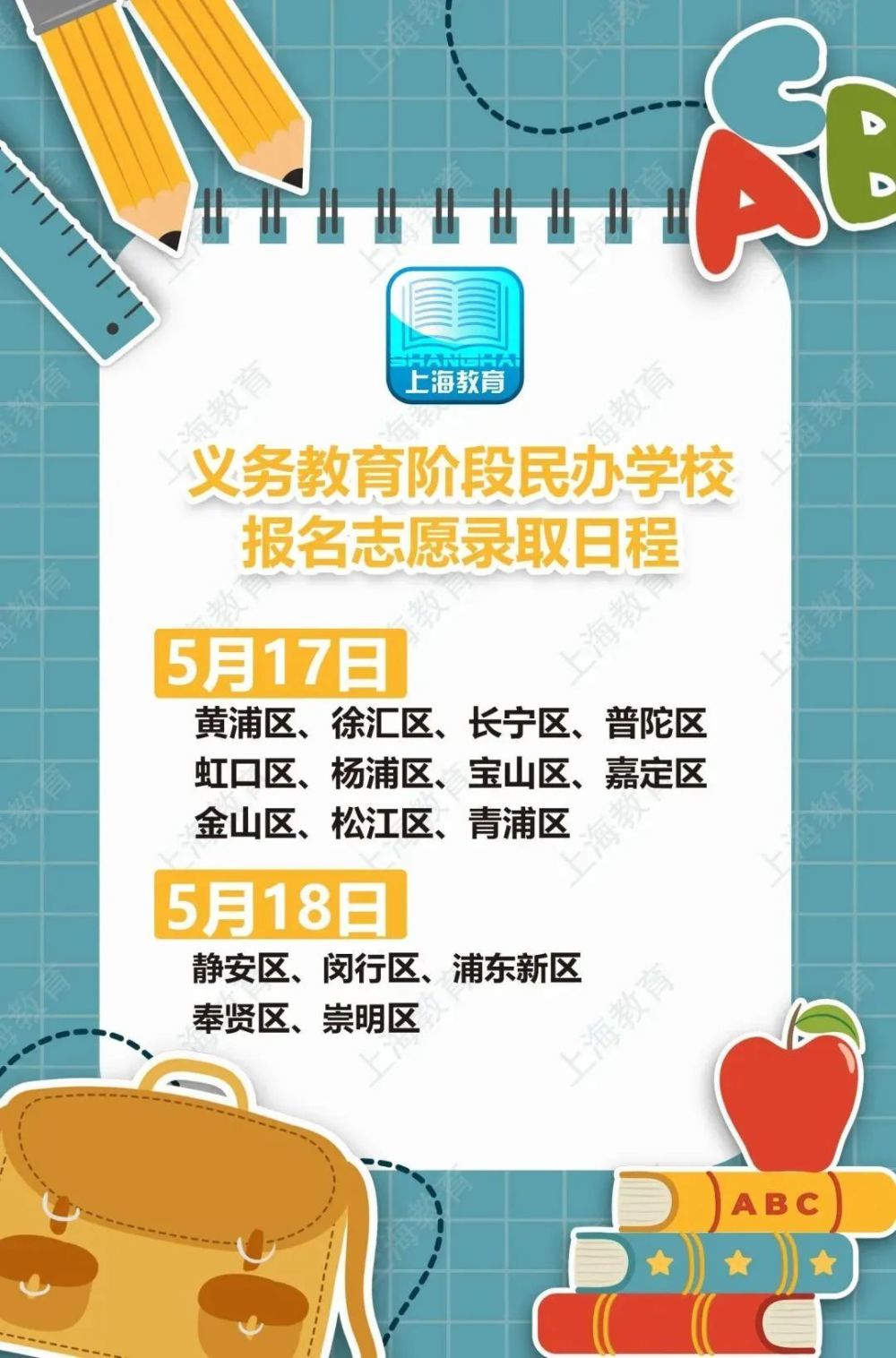 市教委介绍,5月16日-5月19日为各区公办小学第一批验证日。5月25日-5月26日为各区公办小学第二批验证日。5月17日-5月18日本市将开展义务教育阶段民办学校报名志愿录取。