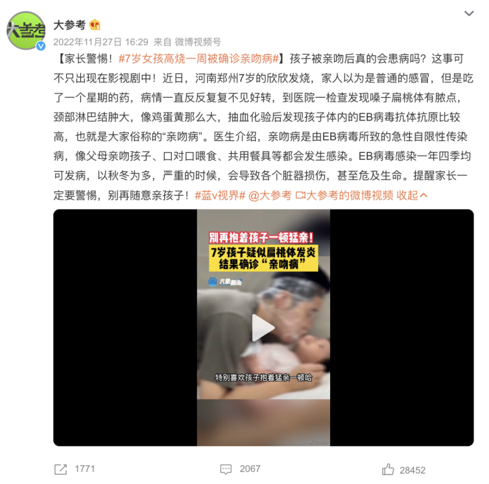 话题#婴儿被亲友轮番亲吻高烧近40度#