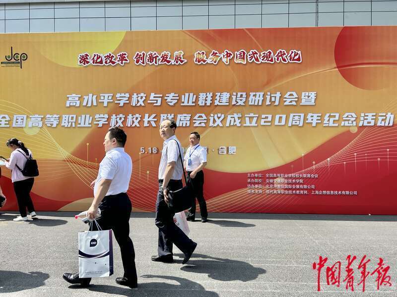 5月19日,“高水平学校与专业群建设研讨会暨全国高等职业学校校长联席会议成立20周年纪念活动”在合肥举行。图为代表从会议展板前走过。中青报·中青网记者 梁国胜/摄