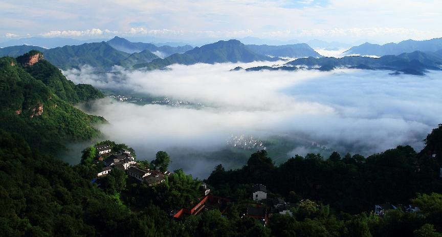 天台山,你若敢来,绝不负你!一座座青山只露出一个个山尖,仿佛是大海里的小岛,在云雾之中若隐若现;雪白的云团像海浪一样在空中翻滚着,碰撞着;村落更好似浮在云海面上,远离城市的喧嚣,使人感到如入仙境。