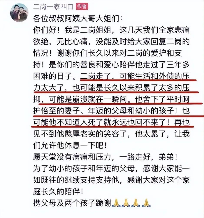 可是,就在大家为他加油打气,希望看到他继续分享更多的生活日常时,就在今年3月7日,二岗的姐姐在网上发布了他自杀离世的消息。