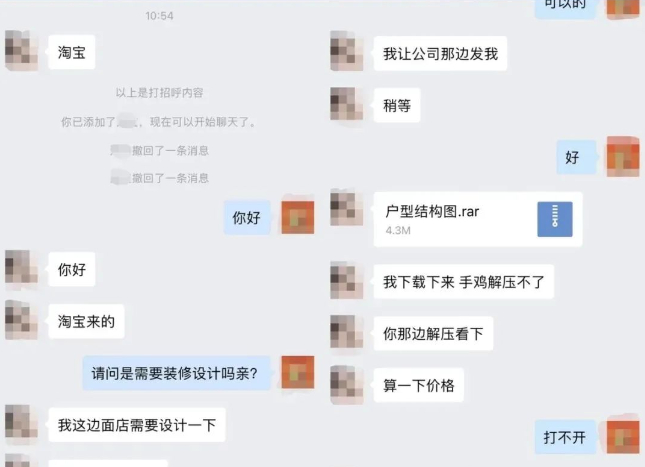 近日,网友萌萌(化名)反馈,因为从事装修行业,她经常会遇上客户加微信后带着户型图来询价的情况。5月初,有客户通过某二手闲置平台找到其店铺咨询装修事宜,两人加过微信后,对方随即发来一个压缩文件,称是户型图让萌萌查看报价。