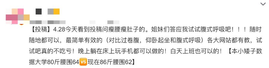 比如,有些姐妹虽然无法坚持每天运动健身,但也会坚持腹式呼吸,来改善体态和腰围。