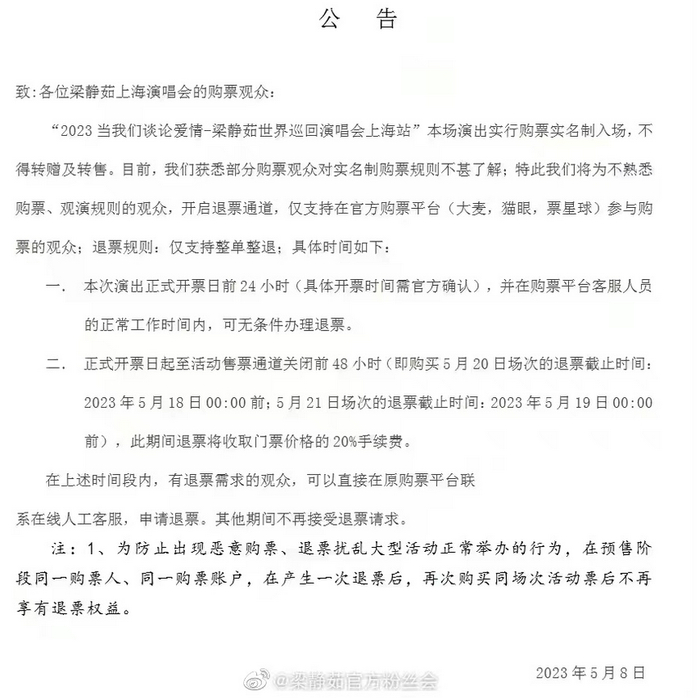 大麦平台解释称,演出票不同于可循环销售的普通商品,消费者一旦购买就产生了“锁定座位,不再流通”的事实。随意退票一方面会影响二次销售,另一方面也会降低“黄牛”囤票的成本,无形中助长了“黄牛”肆意倒票的行为。“在一些热门演出中,常有‘黄牛’通过各种方式提前囤票。若是在开场前,‘黄牛’把卖不出去的票都拿来退,主办方的损失将无法估量。”一位业内人士表示。近期五月天演唱会开票后,就出现了门票被黄牛“围剿”的情况,一度还引发了网络上粉丝对黄牛的抵制活动。
