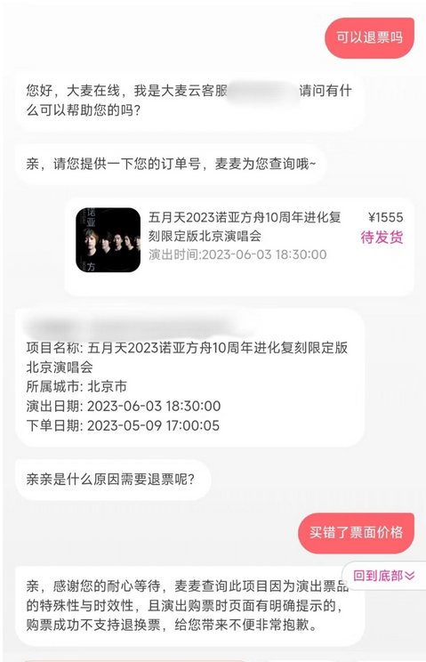 发现票买错了,吴先生赶紧联系客服要求退票后重新下单。“没想到客服来来回回就说:‘演出票具有特殊性与时效性,购票成功不支持退换票’。”吴先生非常不理解,“现在距离开演还有近一个月,根本不会影响二次销售,为什么不让退票?”