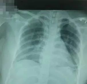 当日复查胸片(图2),再经床旁超声证实左侧大量胸腔积液,行左侧胸腔积液引流,共引流620ml。