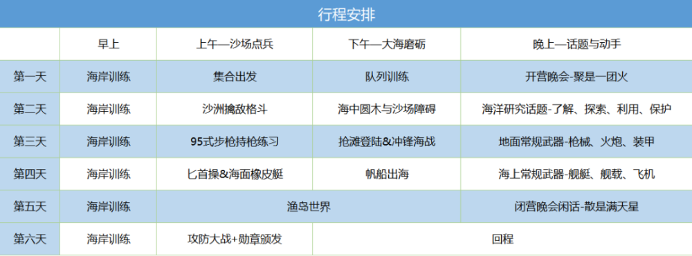 【费用包含】:太原统一出发包含往返秦皇岛6天内所有交通(高铁+大巴),活动期间所有食宿项目体验费;户外保险费用;门票;教练费用;书包、T恤、礼物等,提供营T恤、冰袖及洗漱物品等。