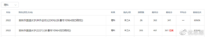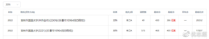 2022吉林省内录取分数线: