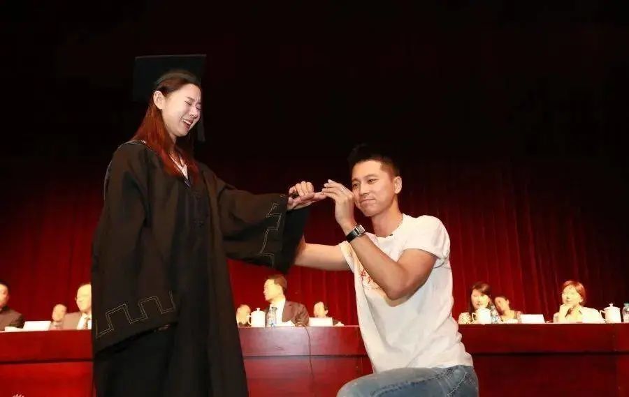 第三次求婚还是在中戏的毕业典礼上,他当着上千人的面跪下求婚,这件事情至今还被人津津乐道,是他们浪漫爱情的见证。