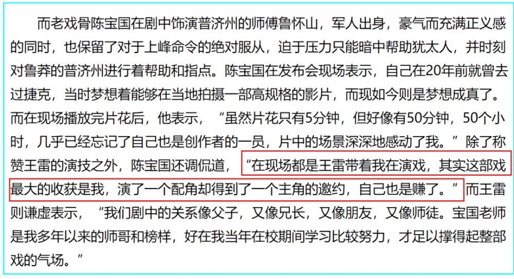 电视剧《最后一张签证》拍摄结束后,陈宝国在发布会上几度哽咽,当着众人调侃王雷在现场带着他演戏。