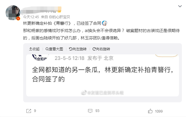 消息来自一位网友爆料,写的是“全网都知道的另一条瓜,林更新确定补拍青簪行,合同签了的。”虽然没有图片,剧方和当事人也没有亲口承认,但能有这样的消息传出来,而且先后两次引发热议,当事方有没有否认,让人不由猜测是否确有其事?更重要的一点,找演员重新补拍,确实是能够让电视剧上线播出的方法,而且差不多是唯一方法。
