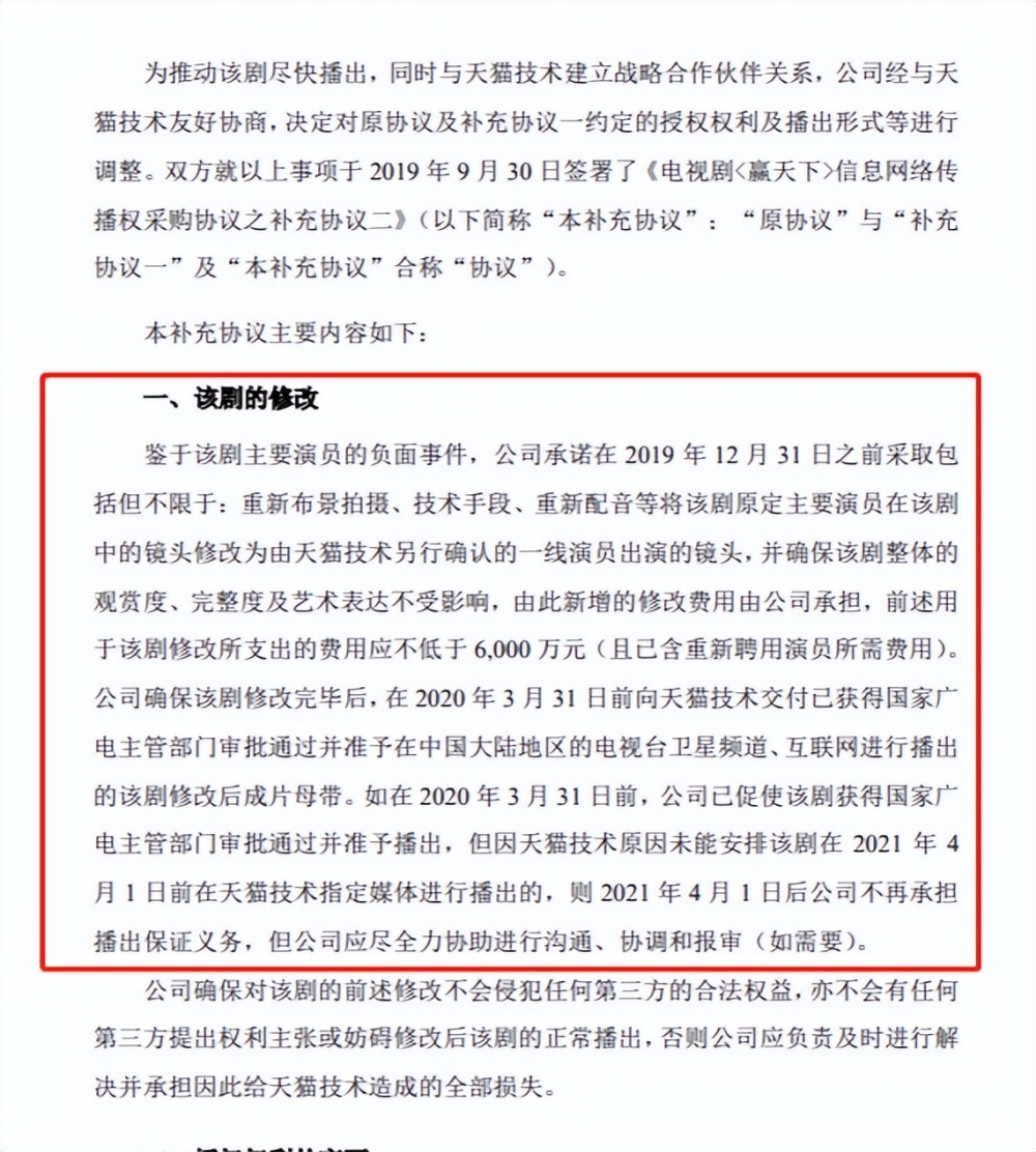 到了2019年10月,《巴清传》(又名《赢天下》)出品方唐德影视发公告,明确电视剧补拍,公告中显示,将在2019年12月31日之前,包括重新布景拍摄、技术手段、重新配音等手段将电视剧原定主要演员在该剧中的镜头修改为另行确认的一线演员出演的镜头,说白了就是换头补拍,即便这样,支出的费用都不低于6000万元。