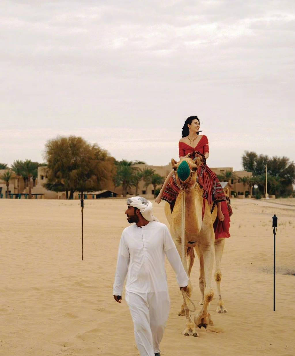 身穿红色露背长裙的她,骑在骆驼上,与沙漠适配度极高。