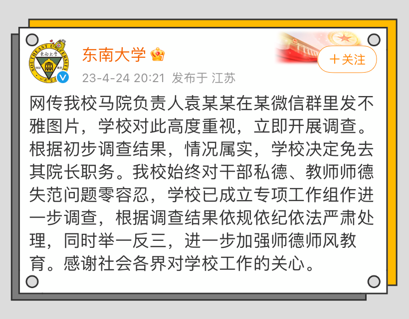 东南大学关于袁久红的丑闻,并没有选择原谅,而是免去了袁久红的职务。