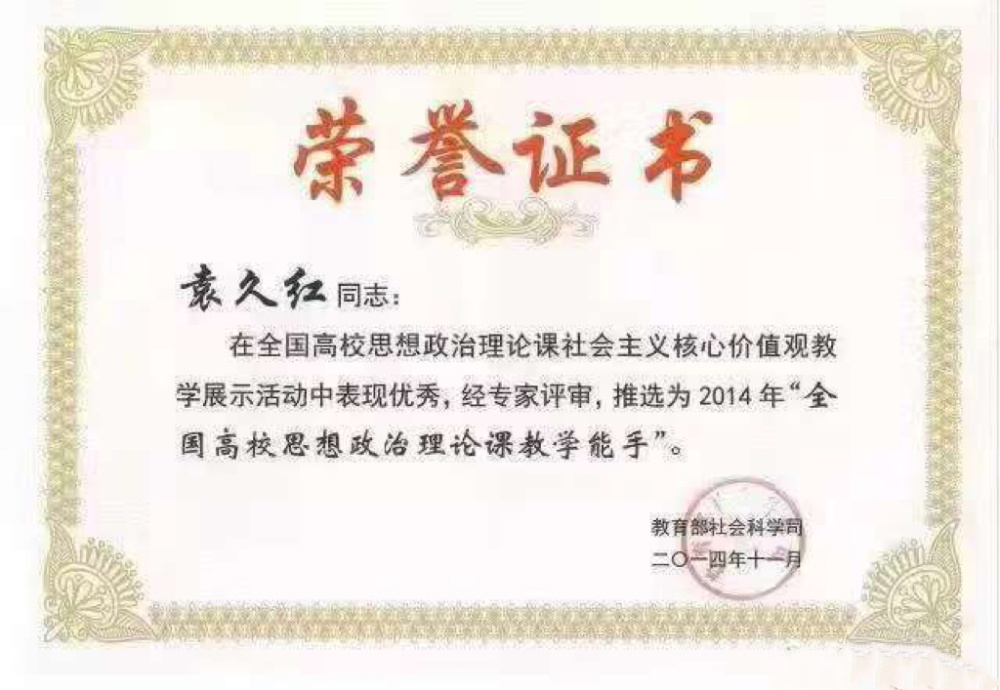 袁久红具有丰富的授课经验,曾经在2014年获得“全国高校思想政治理论课教学能手”。