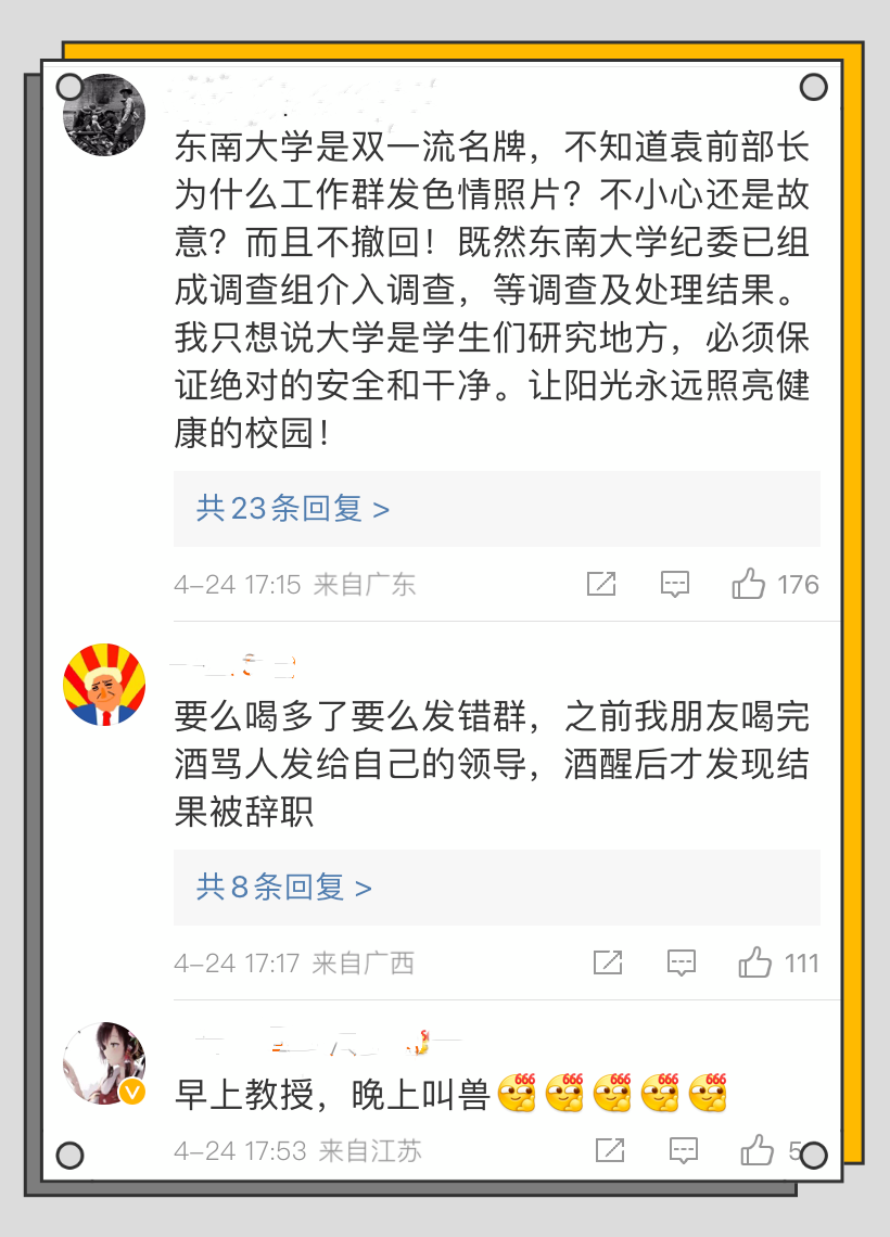 大尺度照片滑入了东南大学332人的工作群,群里迅速炸锅,有人善意地拍了拍袁久红,但是却没有一个人打电话给袁久红。