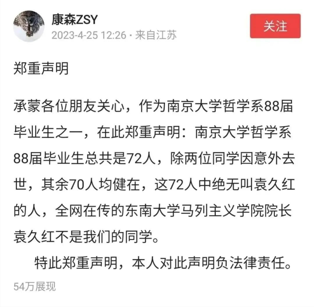 4月27日,袁久红又被曝出学历造假,有知情人爆料南京大学88届哲学系毕业生,总共是72人。