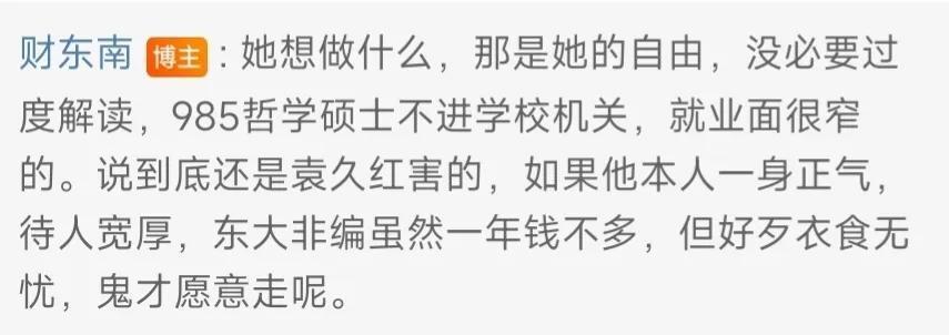 对此“财东南”表示,老婆想做什么,是她的自由,说到底是袁久红害的,虽然老婆没有编制,但是好歹衣食无忧,谁愿意离开那么好的平台。