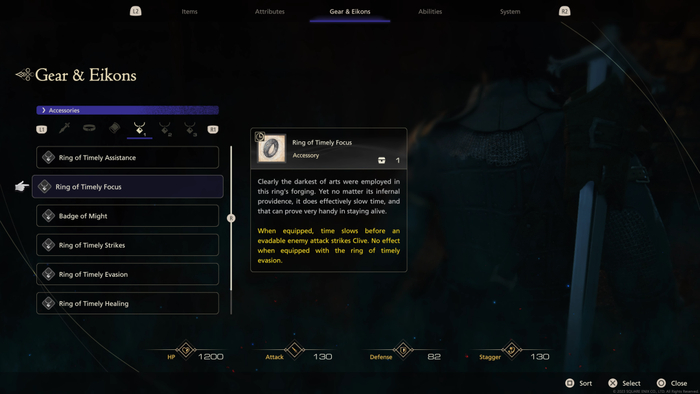 幸运的是,FF16对于这件事有着很充分的考虑,比如“专注故事”模式。FF16的故事模式与其他有类似功能的游戏有着很大的不同,对于操作的辅助并非直接作用于系统层面,而是通过装备饰品的形式来让玩家自行选择是否开启。并且游戏根据辅助程度的不同,提供了多种饰品来让玩家自定义自己想要的操作模式。