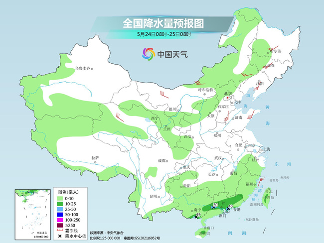 5月24日08时至25日08时内蒙古中东部、东北地区西部、新疆伊犁河谷和南部、西北地区中东部、华北北部、江南东部和南部、西南地区东部、华南、台湾岛等地部分地区有小到中雨,其中,广东中南部等地局地有大雨(25~40毫米)。