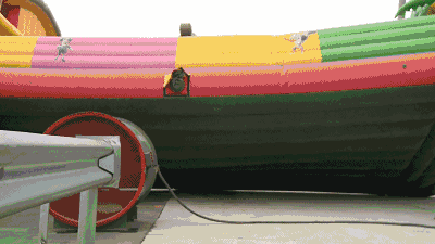 国内曾有团队(好奇实验室)做过实验:当侧面风力达到8级(24米/秒)时,便可将一个占地50平方米、500斤重的充气城堡整个掀翻。