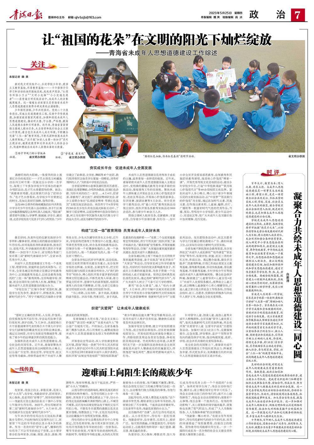 少年强则国强,少年兴则国兴。党的二十大报告指出,实施公民道德建设工程,弘扬中华传统美德,加强家庭家教家风建设,加强和改进未成年人思想道德建设,推动明大德、守公德、严私德,提高人民道德水准和文明素养。近年来,青海省紧紧围绕立德树人根本任务,大力培育和践行社会主义核心价值观,着力优化未成年人成长环境,不断健全完善“三位一体”教育网络,不断巩固和拓展未成年人教育阵地,广泛开展“扣好人生第一粒扣子”系列主题活动,凝聚起教育和关怀未成年人的社会合力,传递和塑造出未成年人崇德向善的正能量。