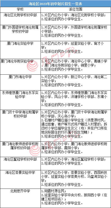 海沧小升初,各中学以学生就读的小学进行划片,划片区域内公办小学毕业生在片区内直升初中(见上表)。
