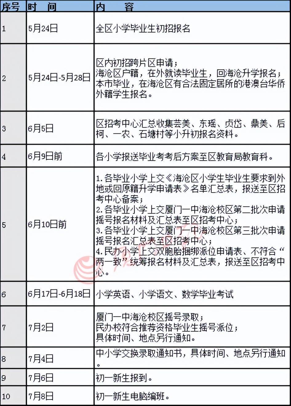 海沧区2023年小学毕业和初中招生工作日程表