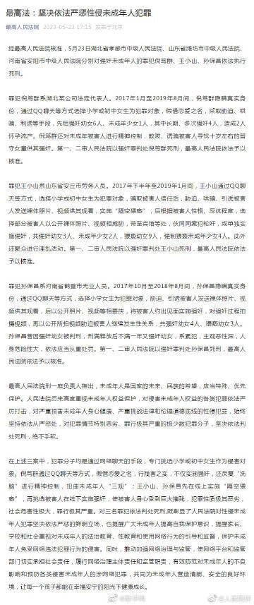 经最高人民法院核准,5月23日,湖北省孝感市中级人民法院、山东省潍坊市中级人民法院、河南省安阳市中级人民法院分别对强奸未成年人的罪犯倪笃群、王小山、孙保昌依法执行死刑。