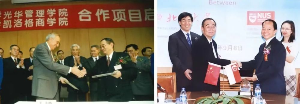 右图:2003年,厉以宁院长与Chistopher Tang院长签署北大光华与新加坡国立大学商学院MBA双学位项目合作协议