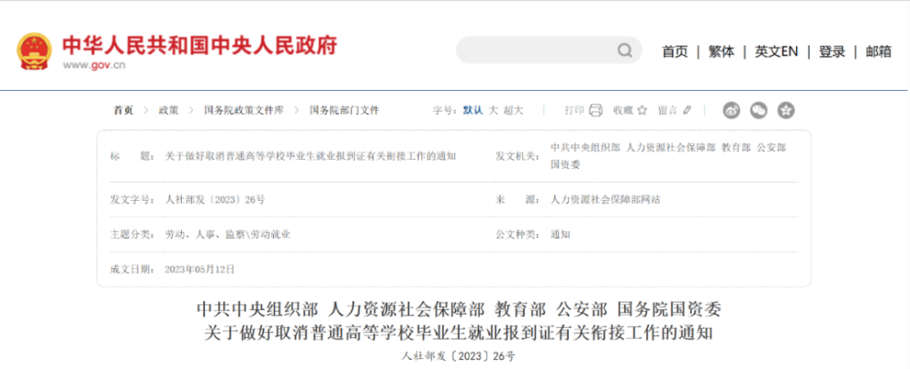 近日,中共中央组织部、人力资源社会保障部、教育部、公安部、国务院国资委发布《关于做好取消普通高等学校毕业生就业报到证有关衔接工作的通知》。