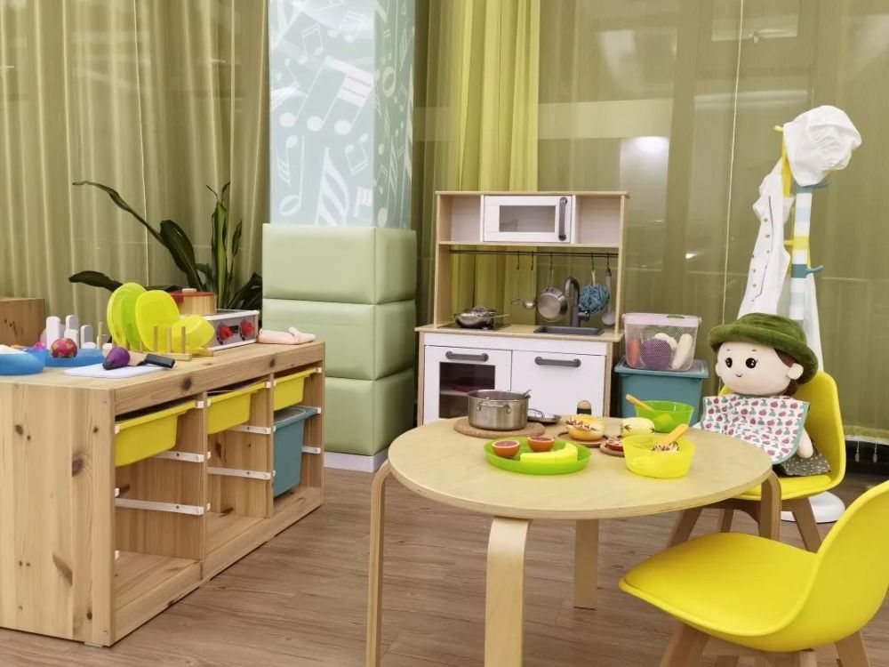 “宝宝屋”的硬件设施和环境布置都是为3岁以下的孩子量身定制。蹲下身来,感受孩子的1米视线——圆角的木质小桌上整齐地摆放着颜料、画笔;低矮的书柜上陈列着各种经典的低幼图书,旁边还有可供孩子阅读时使用的小垫子、小靠枕;娃娃安静地躺在小床上,四周还有与孩子身高相适应的晾衣架、小衣柜、料理台……