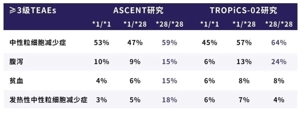 在SG治疗的患者中,常见的≥3级治疗期间不良事件(TEAEs)发生率:中性粒细胞减少症(52%)、腹泻(10%)、贫血(8%)和发热性中性粒细胞减少症(6%)。*1/*1、*1/*28和*28/*28基因型患者的≥3级TEAEs:中性粒细胞减少症(45% vs 57% vs 64%)、腹泻(6% vs 13% vs 24%)、贫血(6% vs 8% vs 8%)和发热性中性粒细胞减少症(6% vs 7% vs 4%)。在SG治疗的患者中,54%的患者(*1/*1,33%;*1/*28,49%;*28/*28,11%)使用过骨髓细胞生长因子(第一次SG给药时或接受SG治疗后)来治疗中性粒细胞减少症。TEAEs的管理策略与UGT1A1状态无关。