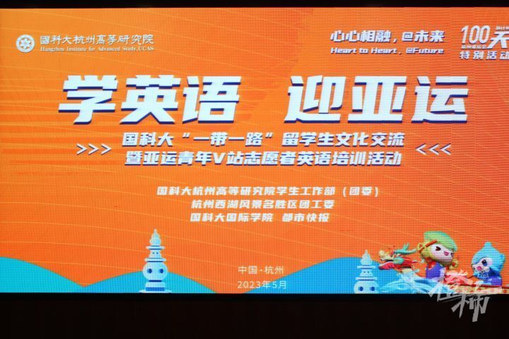 今年恰逢“一带一路”倡议提出10周年之际,杭州也即将举办第19届亚运会,5月18日,国科大杭州高等研究院(以下简称杭高院)联合杭州西湖风景名胜区、国科大国际学院和都市快报,在西湖博物馆共同举办“学英语 迎亚运”——国科大“一带一路”留学生文化交流暨亚运青年V站志愿者英语培训活动,本次活动也是杭州亚运会倒计时100天特别活动。