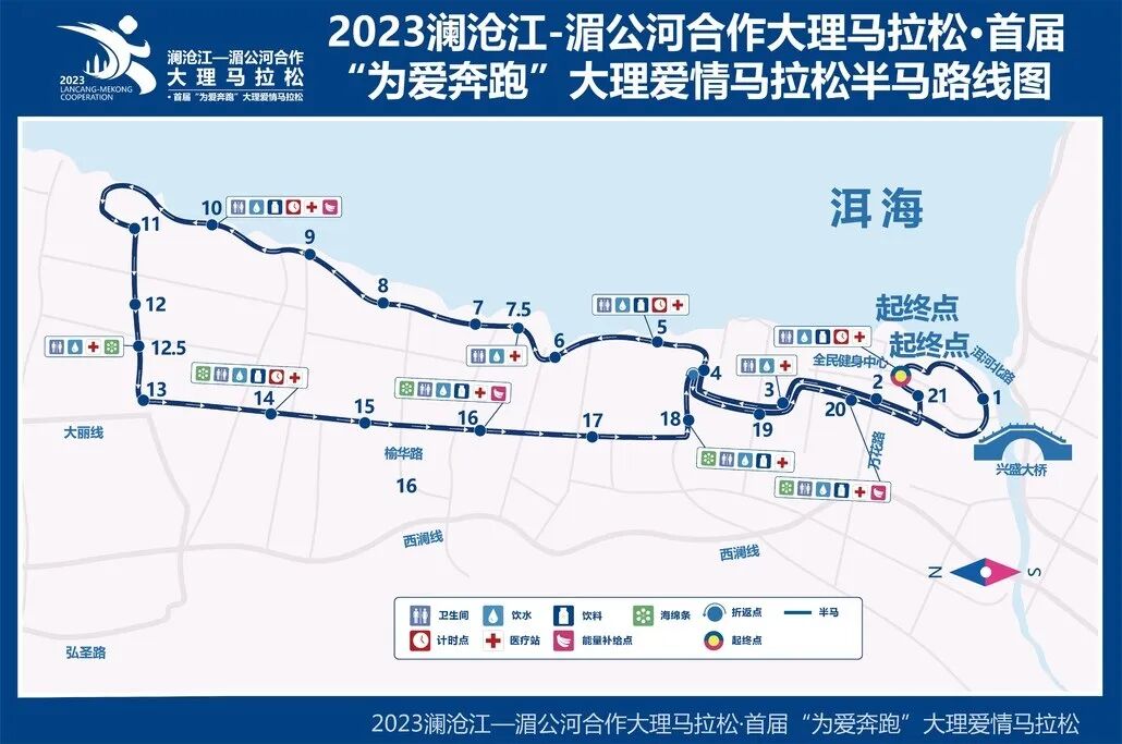 比较大理马拉松全程路线和半程路线,10-11公里开始有变化,全程继续往前进即往北跑,半程整体开始向下拐即往西拐。