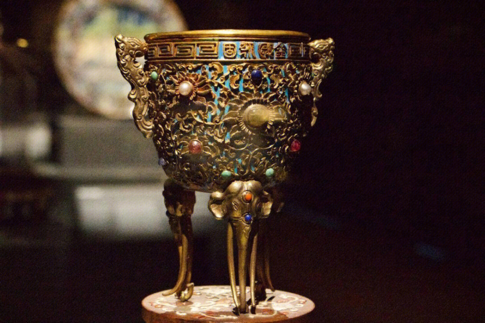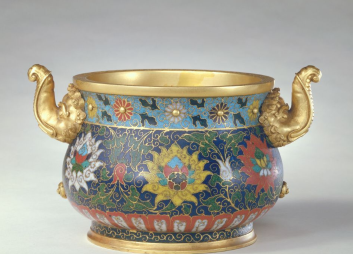 掐丝珐琅缠枝莲纹象耳炉是故宫十大镇宫之宝中珐琅之宝,出品于元代,景泰年间又经过改造,整个器具颜色十分鲜艳,看起来雍容华贵。