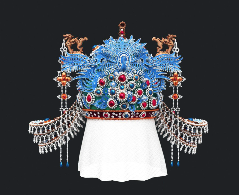 该冠是用漆竹扎成帽胎,面料以丝帛制成,前部饰有九条金龙,下有八只点翠金凤,后部也有一金凤,共九龙九凤。