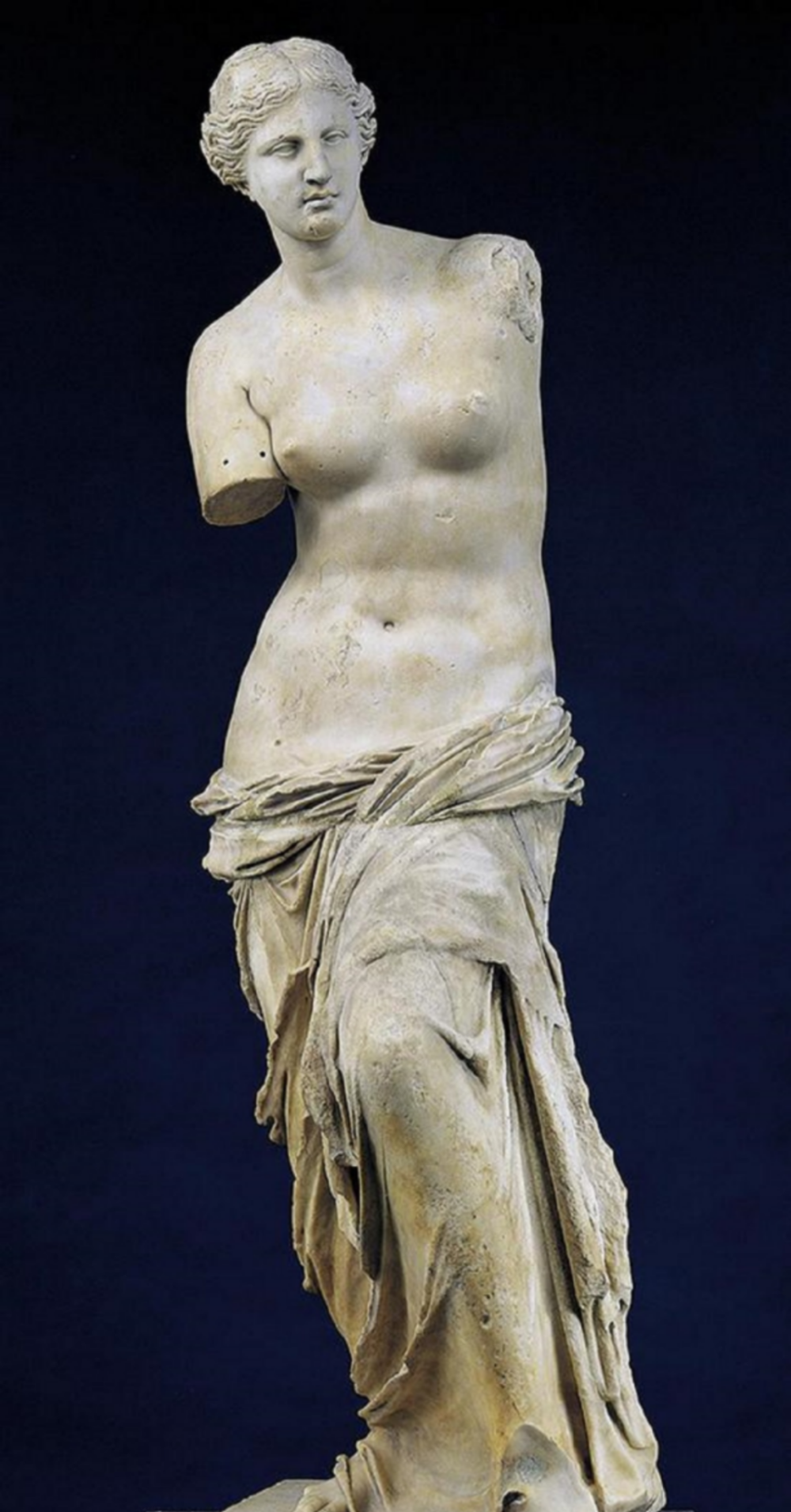 雕像展现爱神维纳斯端庄秀丽的身材。她那微微扭转的姿势,使半裸的身体构成一个和谐而优美的螺旋形上升体态,充满了艺术魅力。