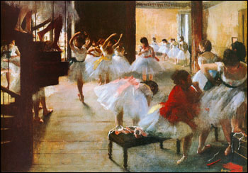 《舞蹈教室》应该是德加芭蕾舞女画中较有代表性的一幅。仔细观察画面,可以发现没有哪两个演员的动作是完全一样的。