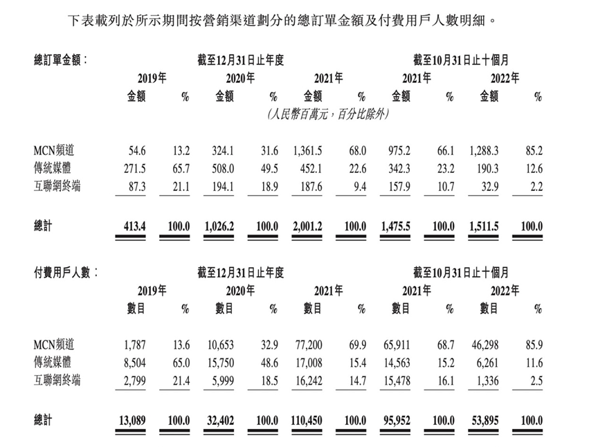 在2019年,MCN频道给九方财富带来的订单收入仅为0.55亿元,占总订单金额的13.2%。到了2022年前十个月,MCN频道带来的订单收入高达12.88亿元,占九方财富总订单金额的85.2%。