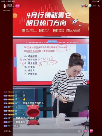 在某短视频平台每晚八点多钟的直播里,“来,大家先把我们直播间的赞往3万冲一冲。没有点关注的,左上角把关注点起来,尤其是喜欢做短线的朋友。”一位三十多岁的女士在直播间时不时口播,她在分析最近的热点板块,比如“AI三兄弟”。如果需要更细致的讲解,“大家点右下角小风车,有个9.9元的门槛”。