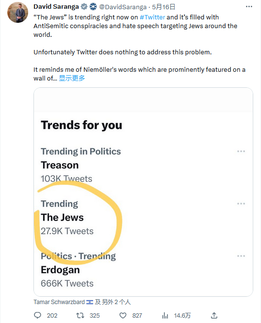 该国外交部数字外交主管大卫·萨兰加(David Saranga)紧随其后发文称,推特上充斥着针对世界各地犹太人的反犹阴谋和仇恨言论,“不幸的是,推特没有采取任何措施来解决这个问题。”