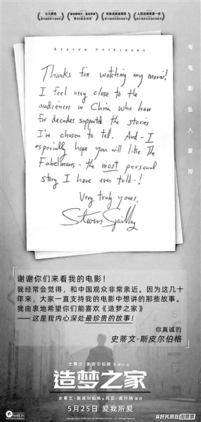 除了视频,斯皮尔伯格还别出心裁地准备了一封手写信作为惊喜礼物,他在信中写道:“谢谢你们来看我的电影!我经常会觉得,和中国观众非常亲近,因为这几十年来,大家一直支持我的电影中想讲的那些故事。我由衷地希望你们能喜欢《造梦之家》——这是我内心深处最珍贵的故事!”