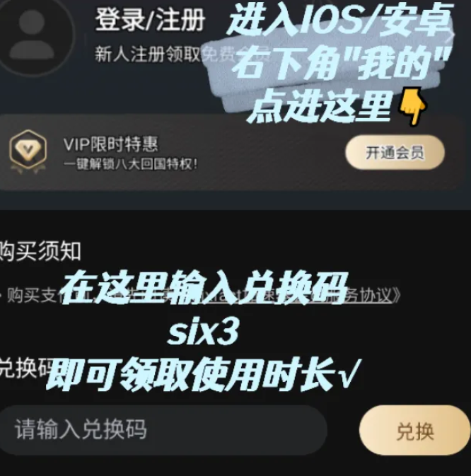 如果提示已过期或时长不够,则可以参照下图方法,在电脑Sixfast客户端输入兑换码six3获取使用时长: