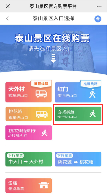 泰山东御道游览线路门票预约方式:关注“泰山景区”微信公众号,点击菜单栏:微信购票→购买门票,即可进入门票预约界面。